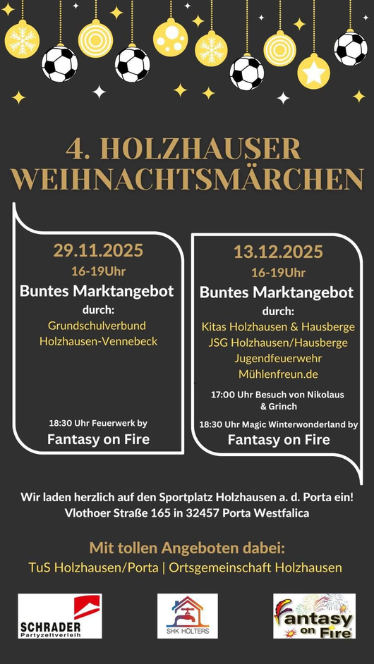 Ab 16:00 Uhr findet am Samstag vor dem 1. Advent auf dem Gelände des TuS HoPo (Vlothoer Str. 165) der 1. Tag des Holser Adventsmarktes statt.